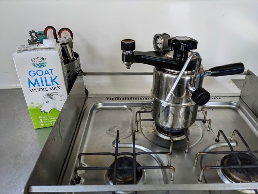 Alec had carefully planned the menus for the trip. Because of the panic-buying of milk in the supermarket, there was no cow milk left and he had bought goat milk. He made an espresso coffee for me. I had never had coffee with goat milk before but it was tasty.