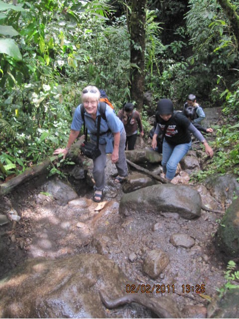 The way up was through a forest of giant trees with lush foliage, taking us over a river, rocks and through thick, slippery mud. Bright orchids flowers graced some trees, and a musty smell pervaded the air. Leaning against one of the trees when we stopped for a short while, I felt very small, so tiny. I closed my eyes and gave thanks for the beauty and gifts that trees give us. My back against the thick trunk felt supported and strong, so I harnessed the strength to continue. The going was steep, and I found myself slipping and slowing down. Argys had offered to take my camera so that I would have many pictures without having to stop so often. He literally leapt around snapping photos from every angle — yet another thoughtful gesture.