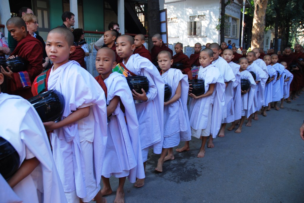 Our first stop was the Mahagandayon Monastery where more than a thousand monks live and study. A large group of tourists had gathered under the morning sun to see hundreds of monks return from their morning trek through the village with their begging bowls seeking food for the main meal of the day. Security police and a few senior monks, curiously chubby looking, created order of the disarray of Chinese tourists of every size, shape and colour behind police barriers, clear of the roadway where the returning monks would be walking. A hush and then a rumble of whispers announced that the monks were approaching down the street from the distance of the nearby village, walking briskly in a single file, holding their begging bowls, now filled or filling up fast with the charity offered to them. People from the sidelines approached with fruits, packages of biscuits, and the like, and even money, a thousand khat here and there which actually represents less than a dollar, but in local terms meant something; and given the size of the crowd could add up to a reasonable hoard. I took note of the soft, youthful faces of the young monks, their heads shaved clear and wearing the traditional orange wrap-around robes that we have become familiar with in Thailand. Some of the monks were very young indeed, children, eyeing the onlookers impishly and seemingly ready for flight. My friend Peter had a clear advantage as his giant stature afforded him the luxury of towering over everyone in sight to have an unimpeded view of the procession of the monks into the monastic enclosure. The monks soon disappeared into the surrounding buildings where they would have their one and only late morning meal of the day.