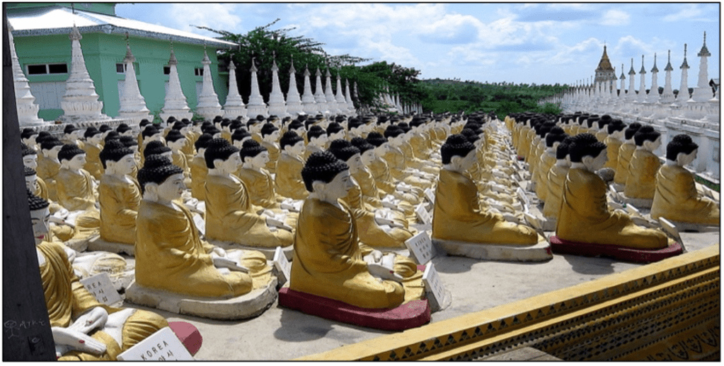 After breakfast, we met up with our beloved guide Swan again in the hotel lobby. “Not another pagoda,” I cried out in mock dismay, but Swan was now attuned to my humour and took up the slack by affirming that indeed we would be visiting another remarkable pagoda surrounded by 845 small stupas as though in deferent tribute to the richly decorated central pagoda. Work began on the pagoda in 1939 at the start of the Second World War and was finally completed in the March of 1952. There are many buddha statues row upon row in niches along the walls, all coloured gold, a truly sublime sight filled with religious nostalgia. The entrance is protected, not by the traditional mythical lions, but by the statues of the magnificent white elephants that are sacred and auspicious in Buddhist symbolism. Thereafter, we took a short walk through the nearby banyan tree grove Boddhitataung, where a thousand Buddha images lie at rest among the sprouting banyan trees. Ah, walking through the aged banyan trees is like walking through an ancient grove associated with the mythic gods of Greece. One half expects a centaur or unicorn to come trolling through the corridors of trees in this mystical setting. The banyan trees is considered sacred in places like India and Burma and is well known for the mercy of its abundant shade. In fact, in India, the leaf of the banyan is said to be the resting place of the Lord Krishna.