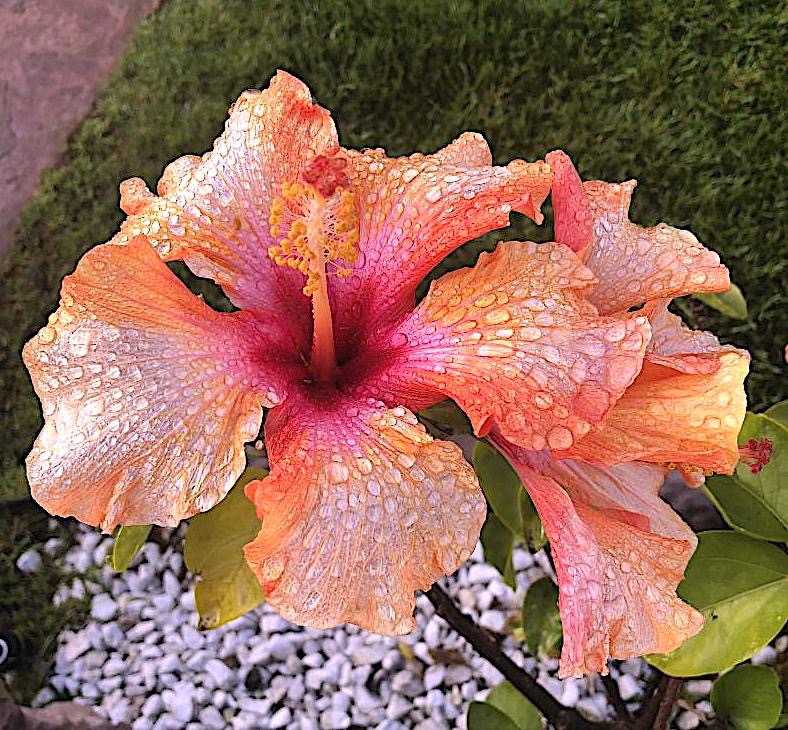 The morning’s dew on hibiscus reflects the tangerine sunrise diverts focus beyond teardrops.