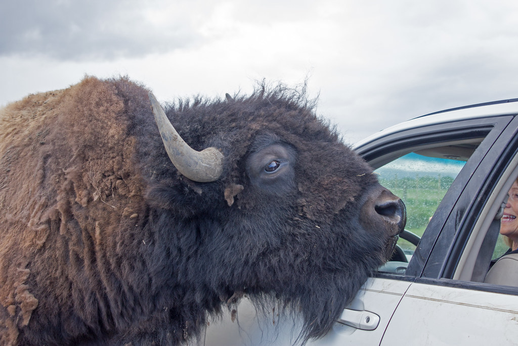 The smell of fresh bread (bought at the farm, outside food is a no-no!) attracted the animals to us. While we were throwing slices to the young llamas, small groups of older llamas came up and that was rather intimidating; at times, we were surrounded, rather imprisoned in the car for several minutes until another passing vehicle caught their attention. Llamas, Tibetan yaks and elks daringly peeped from outside, smeared the glass windows abundantly with their saliva, especially when we did not open them to offer food.