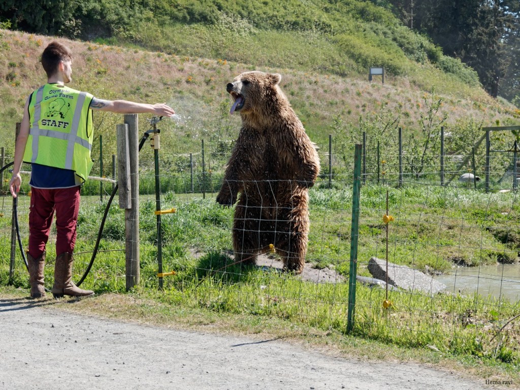 The most interesting field was the enclosure that had over a dozen brown-bears. For over five minutes, we watched and took pictures of one of them drinking water, simultaneously enjoying a shower. Beckoning the ranger, the playful bear opened its mouth wide and let out its tongue, gesturing him to place the pipe over its open mouth…..through gestures, it signalled that it wanted water over its body. The spectators watched through their car windows in childlike glee.