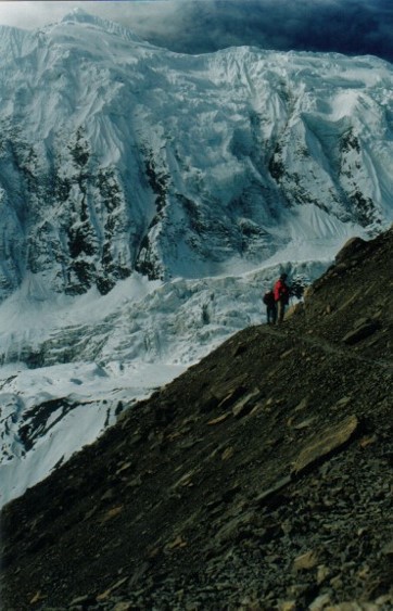 A cold wind was blowing, and the trail wound through scree[3] slopes. The hike was becoming treacherous, and we did some of the worst sections on our hands and knees. The mountain views were becoming spectacular as the Himals closed in on the valley. Our heavy backpacks threatened to unbalance us and push us over the edge to the Khangsar Khola and Marsyangadi river far below. Thorny bushes grew in the arid landscape and snagged our down jackets. We were worried about the condition of these jackets that we had rented in Pokhara. The shop owner was a patient of my fellow trekker, Dr Praveen Partha.
