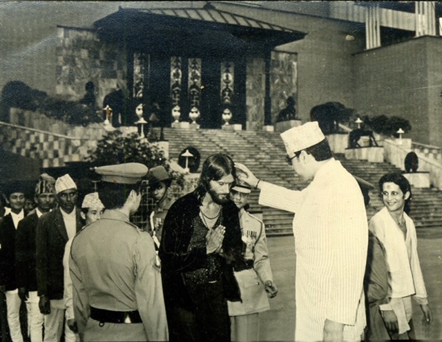 Jim Goodman in Nepal at Dasain being blessed by King Birendra, October 1978.