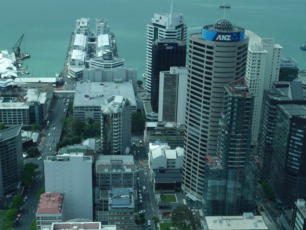 Seen from the Auckland waterfront, where the pedestrian swing bridge salutes the boats as they enter and exit the inner harbour, city centre offers an intense, almost intimidating backdrop of close-packed tower blocks of concrete and glass, overtopped by the sharp needle of the skytower a few blocks further up the hillside beyond the historical shoreline.