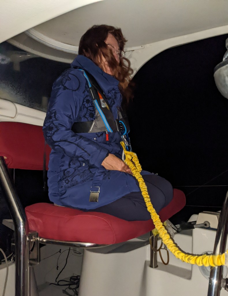 I was so sleepy I was afraid the lurching of the boat might hurl me into the ocean. Alex attached one end of the bright yellow tether to my life jacket and the other to a clasp under the helm.