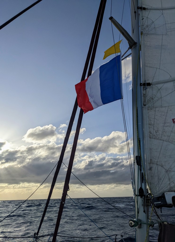 We arrived in the evening of day six, five days and ten hours after departing from Australia. Having failed to contact the port earlier in the day, we anchored at a suitable distance from the shore in Baie de L’Orphelinat. As a foreign vessel, we flew our bright yellow quarantine flag above the flag of our host country, France. Flying the host country’s flag, far from being a nicety, is a centuries-old maritime tradition that indicates that sailors come in peace.