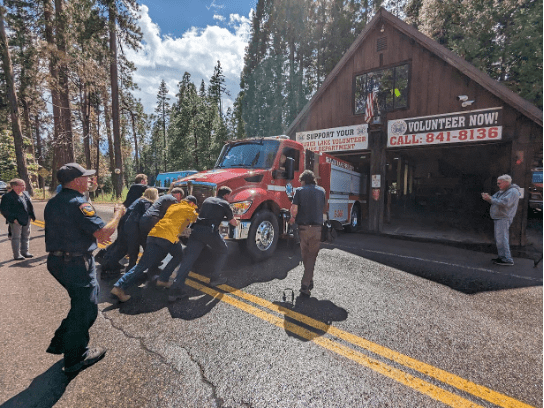 In August, 2023, James and Janet invited us to a fire-truck “push-in ceremony” at Shaver Lake, to celebrate the arrival of a new firetruck. We drove to the township the next day at three pm. The road was blocked by the flashing lights of the sheriff’s patrol cars. We turned back and parked the car, and then entered the township on foot. A crowd of well-wishers was cheering the volunteer fire-fighters, who were pushing the shiny new firetruck into its new home. They strained as they pushed it into the narrow confines where it will be housed. Once it was pushed in, the crowd cheered, and everyone was offered a free ice-cream.