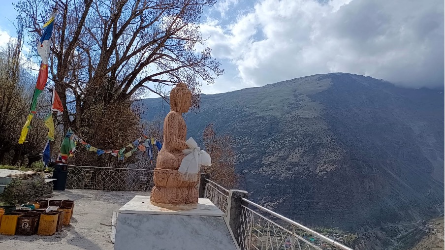 The monastery is an important one of Drukpa lineage[1] built in the twelfth century. The beautiful white facade with gold details gleamed in the sunlight. Intricate thangka paintings adorned the walls and ceiling of the monastery. It was perched on the barren mountain of Lahaul with multi-coloured Buddhist flags swaying in the wind. An imposing statue of Lord Buddha sat in the courtyard, looking over the whole valley. There was still some snow on the mountain tops, spring had just set in.