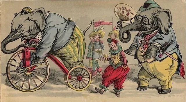 At that stormy moment, trumpets, trombones, drums and cymbals sounded below, silencing the brawlers for a brief moment. Then from out the side flaps two baby elephants charged, trunks held high, trumpeting louder than the fanfare! Atop them, seated in howdahs apparelled in the most royal regalia were yelping mahouts fitted out in cowboy costumes, waving their huge cowboy hats at the now stupefied spectators. The elephants chased the clowns around the ring, grabbing a few with their trunks, rolling them up then flinging them into the air. The elephants had gone amok, lifting their trunks for all to see their huge flabby smiles. The living torso was passed high over the mahouts’ reach, mouthing furious flames galore, landing with a thud in the arms of a receiving clown on the other side. The children in the front rows were on their feet howling with merriment, laughing along with the clowns and elephants as the chase continued on its merry-go-round way. And here the band struck up a favourite tune to which all the clowns sang: “Zozo the clown and his funny hat, patches on his pants and he’s big and fat, long flappy shoes and a round, red nose, makes people laugh wherever he may go.”