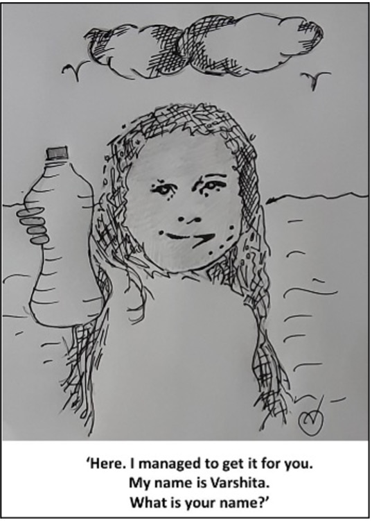 Laughing aloud, she wades two metres into the sea when the nearest incoming wave is still a few metres away.  She retrieves the bottle, turns and walks up to the girl, and says, “Here. I managed to get it for you. It was easy. My name is Varshita. What is your name?”