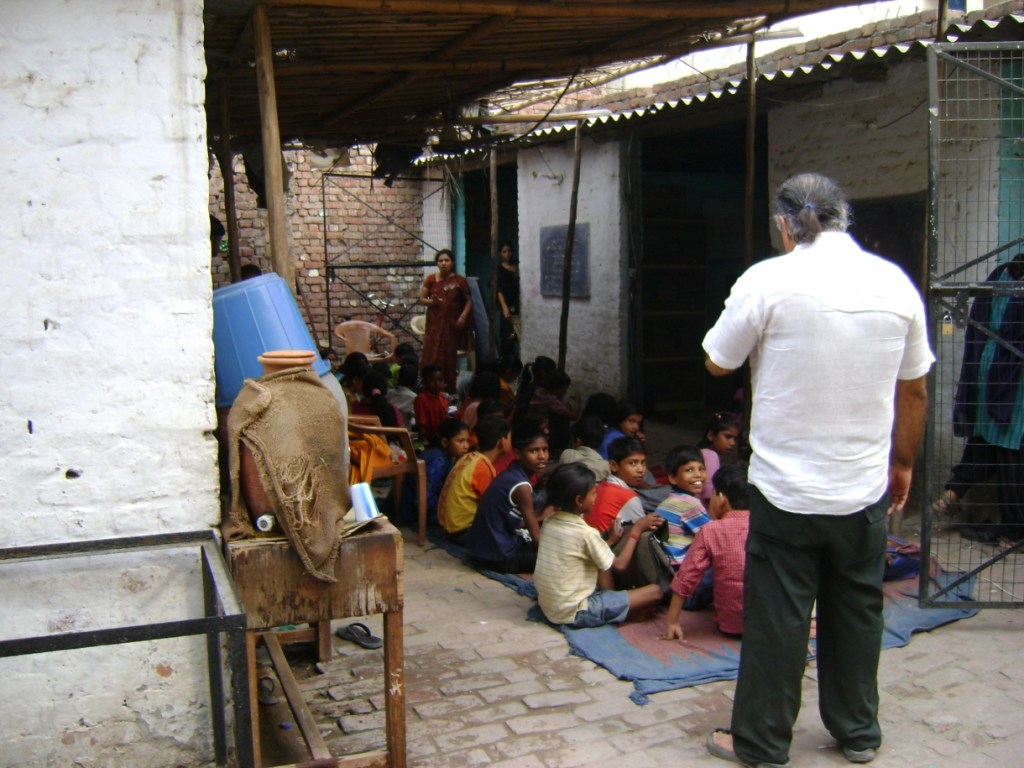 The late Sanjay Kumar (1961-2025), founder of pandies’, creating a story collective at a workshop being conducted for the children at Nithari. Photo provided by the late Sanjay Kumar