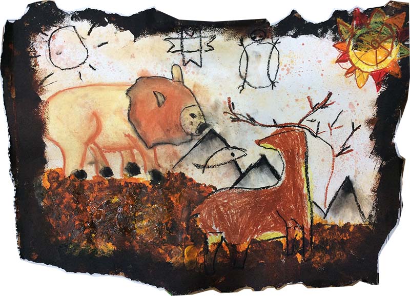 Hence, the cave became their point of reference, their realm of eternal childhood, more intimate than either school or home, their retreat of borderless imagination. Day after day on those barren walls within the dry darkness of their grotto-world, their imagination, so fertile because bubbling over with youthful turbulence, brought to life animal figures, first hewn with small chisels then painted with fingers (especially thumbs), or with sticks, brushed over with clumps of grass. No paint-brush was ever used. Their painting techniques remained those of prehistoric cave-artists.