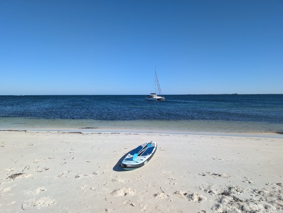 Alex anchored and by this time the windless had stopped malfunctioning. We then lowered the paddleboard. Alex knelt at the rear and I at the front, relieved to dismount our steed of the seas. I held myself steady as he paddled firmly behind me to the shore. We alighted at the sand, pulled the paddleboard to a safe height, and washed the sand off our flip-flops under a tap. A wall of hot air from the land accosted us, and the ground continued to gently canter beneath us as our bodies recalibrated to being on terra firma. Our discreet entry on the paddleboard had attracted no attention. We walked past children playing in the foreshore fountain, found a place to sit on the lawn alongside other family groups, and tuned in to savour the comforting 1970s pop music being performed by the live band.