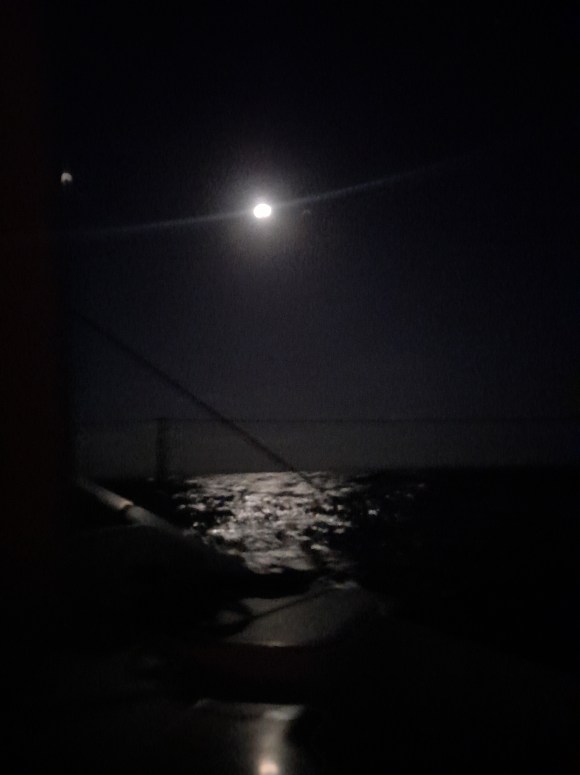 I looked out at the waters beyond the stern. The black waves danced in the moonlight. The swell pushed the boat in all directions, slapping against the water. I was unable to move around the boat without planning every movement. Thankfully, all the edges were rounded so even if I bumped into something I would not get hurt. I had remained in my pyjamas all day because I was unable to stay still enough to open drawers, retrieve clothing, and get dressed. I was unable to comb my hair because walking to the cupboard and retrieving my comb was too hard given all the bumps. Our bags had all fallen to the floor.