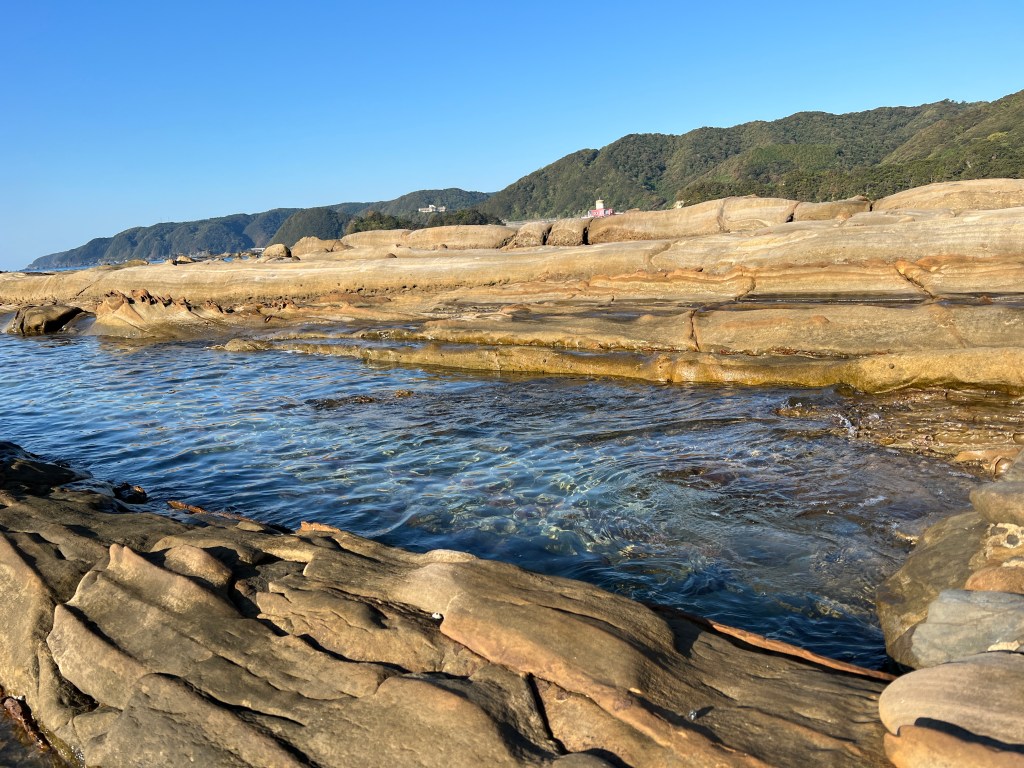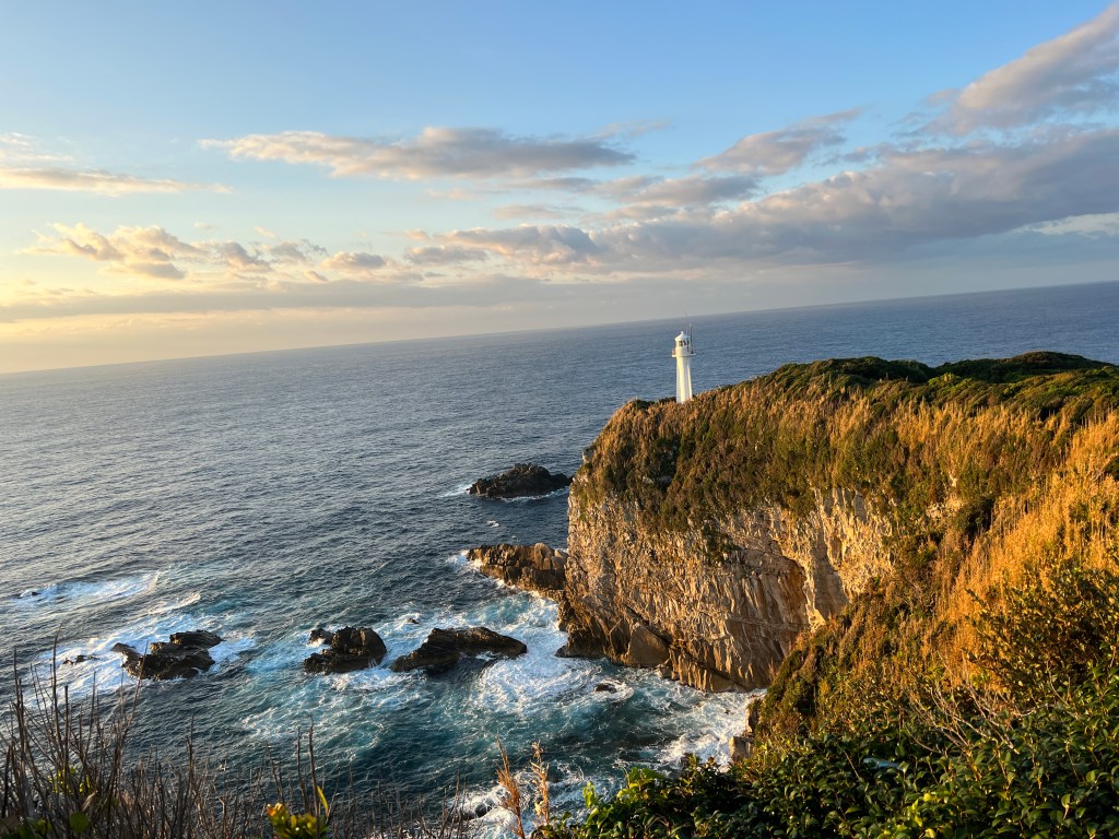By the time we arrived, the sun was setting. We went to Tosashimizu Geopark to see the sunset. Though we were late, the orange glow lingered, and the lighthouse in the distance glowed beautifully.