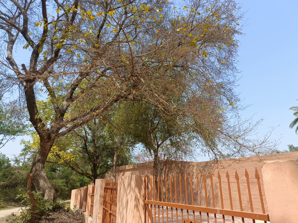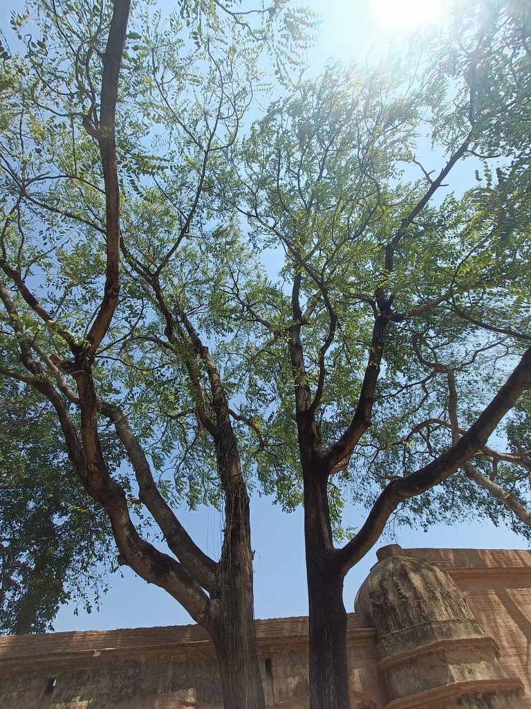 A dargah (miniature Sufi shrine) greets one at the outer end of the compound while a majestic gulmohar tree seems to appear like a tall fellow wearing red scarves. Arches and domes subsist in this sturdy network of walls.