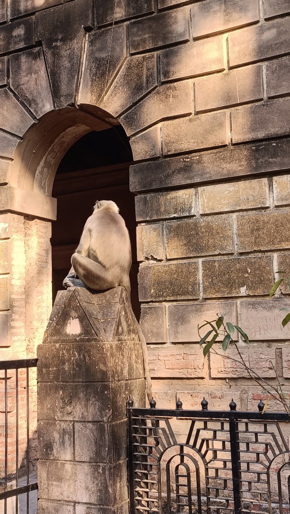 Sunlight lights up its walls and every now and then a langur(monkey) sprawling his long tail stands guard over the gates. The staircases, spacious compound, arched entryway and the glory of the Greek columns touched by the inimitable mix of lakhauri and current-day refurbishments awe us.