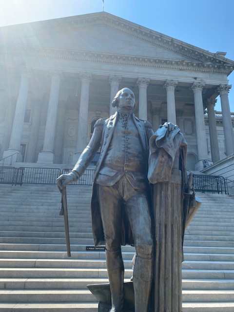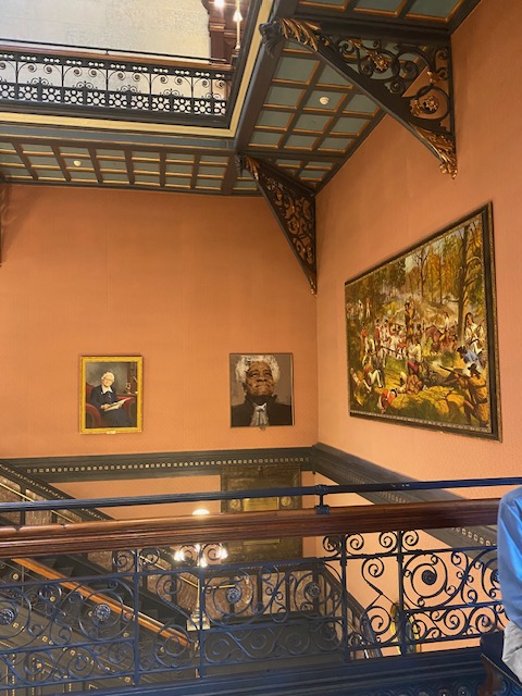 During the rest of the tour, I breathed a bit easier, admiring the intricate ironwork on the stair railings, and the stained glass above the chambers. I enjoyed hearing that Magdalen Feline, a woman goldsmith had crafted the symbolic mace, which is placed in a rack at the front of the Speaker’s podium when the House of Representatives is in session. And I was pleased to see a portrait of African American educator, philanthropist, and civil rights activist Mary McLeod Bethune (1875-1955) prominently displayed.