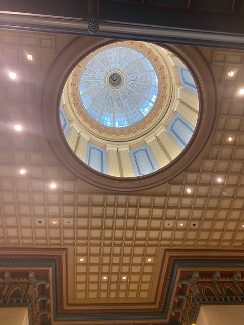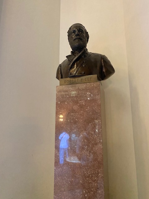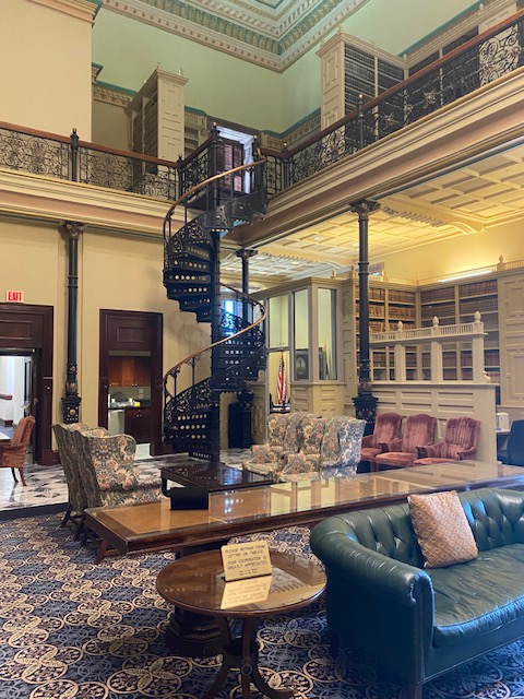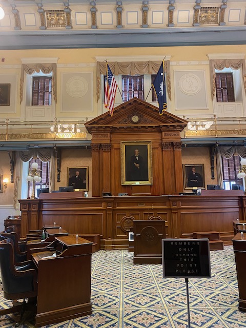 We went inside the building and were ushered to a room off to the side for a short film before the tour began. I noted that the film was narrated by a young African American man, which seemed like a nod to diversity, equity and inclusion. He mentioned, perhaps with false pride, that Strom Thurmond held the record for longest filibuster in the history of the United States. Nevertheless, I was glad to see that the film highlighted the achievements of women and minorities, such as South Carolina’s first – and so far, only – female governor, Nikki Haley, the one who ordered that the Confederate flag be removed from state grounds.