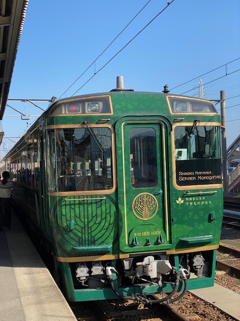 I’d wanted to go on the Shikoku Mannaka Sennen Monogatari (One Thousand Year Story in the Middle of Shikoku) train trip ever since I saw it advertised on a poster in the window of Tokushima Station. When I investigated, however, I discovered one couldn’t begin the journey in Tokushima, where I live. Although it starts (or ends, depending on which way you’re coming from; it’s a one-way trip) deep in the mountains of Tokushima, I would have to change trains a few times before boarding the special sightseeing train. It would take hours to get there. A better way would be to board in Tadotsu, which is in the neighboring prefecture Kagawa. I could drive there in a little over an hour, take the fancy train to Oboke, and return by express train.