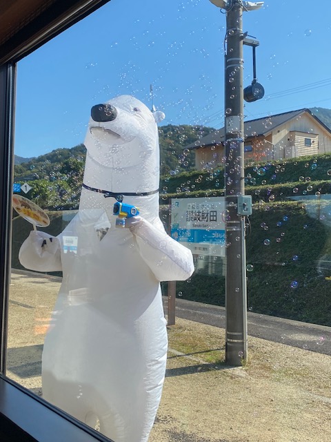 The voice announced that we were nearing Sanuki Saida Station, which boasts a 700-year-old tabunoki tree, said to be a “power spot.” Apparently if you stand under the tree, you can absorb some of its spirit and energy. The tree has also been designated a Kagawa Prefectural Protected Tree. The train came to a stop again, but this time we didn’t get off. Instead, we all whipped out our smartphones to take photos of the person dressed in a polar bear costume shooting soap bubbles from a bubble gun. The baby was delighted.