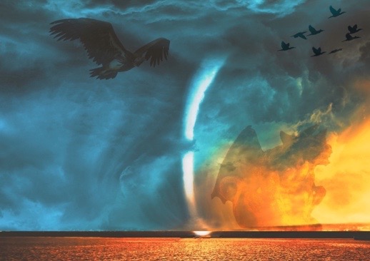 I have always been interested in ekphrastic poetry (Auden’s Musée des Beaux Arts being a particular favourite). Some of my poems have been inspired by or accompanied by relevant images. About 5 years ago, I started to experiment with composing digital art that used the imagery in a poem (a ‘painted poem’, if you like). The image below is my attempt at representing some of the imagery in WB Yeats’ The Second Coming (‘the widening gyre’, ‘blood-dimmed tide’, ‘a shape with lion body’, ‘rough beast’, ‘desert birds’). This composition was not created by AI and relevant licences and permissions were obtained for images used.