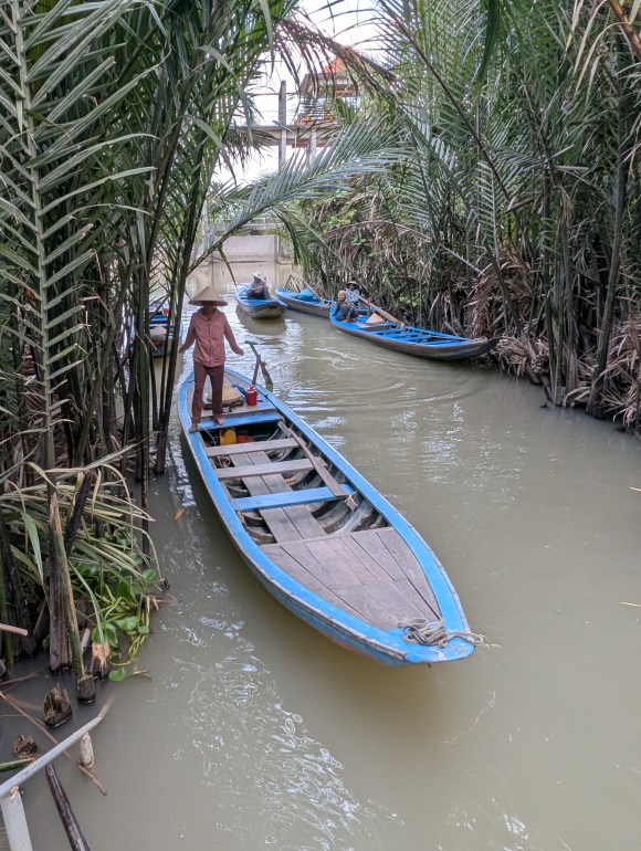 We alighted from the ferry and disembarked at a small island in the Mekong Delta. Our Vietnamese guide had promised us that we could witness how local people lived. After walking along a trail, we were ushered into a small boat with a local lady at the rear who would row us down the river. We stepped into the back of the boat and another couple stepped into the front.