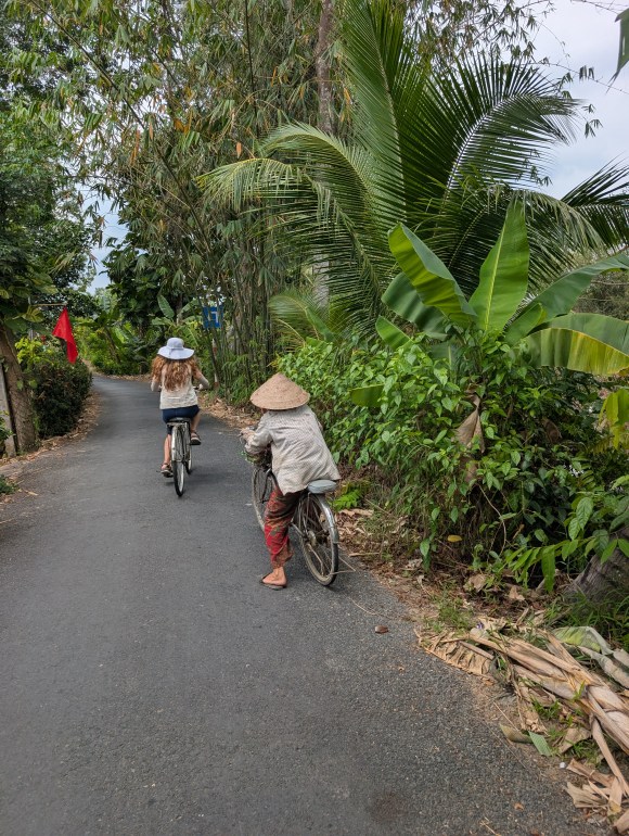 Next, we hopped off the boat and were treated to the chance to hold a cobra, sample local delicacies, and listen to the villagers’ musical performance. The next day we were taken to a restaurant where you could make your own seafood pancakes. Just before lunch, we were given the opportunity to cycle along a nearby path. Those of our group who wished to cycle selected a bicycle. I chose one and headed to the path. Then I looked ahead of me and realised that the English woman’s bike was the wrong size for her.
