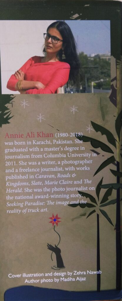 There is a poignant tale to this book. Before the manuscript could see the light of the day, its author Annie Ali Khan died in an accident in Karachi. Annie was merely thirty years at the time of death. A brilliant journalist with a master’s degree in journalism from Columbia University, she was a writer, a photographer with works published in Caravan, Marie Claire and The Herald. She had won Pakistan’s national photojournalist award for her story on truck art.