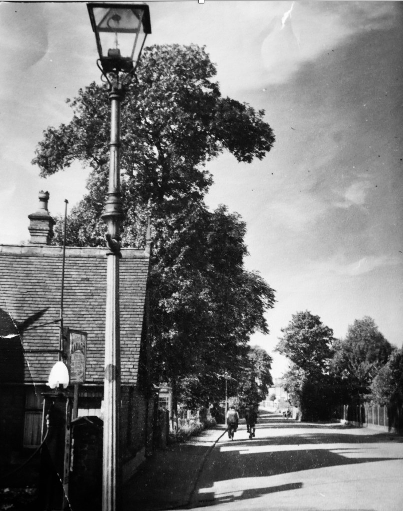 Further along the road, even at this angle, you can make out a window and beyond that another door. This didn’t open into the house but was a yard gate through which you stepped down to outhouses, though I never saw it used: a washhouse with a boiler in the corner, a room with running water from a tap – dad fixed it up as a darkroom for photography. He was a hobby photographer all his life and taught me to develop and print in black and white. This photograph, of which I have several prints must be one of his. There was an outside toilet too, in that yard, lit by starlight and protected from frost by a paraffin heater, with a store shed alongside, both backing onto the road. The shed was eventually hollowed out, its roof left intact and propped up at the corner, and a fuel tank for central heating was installed in the space beneath.