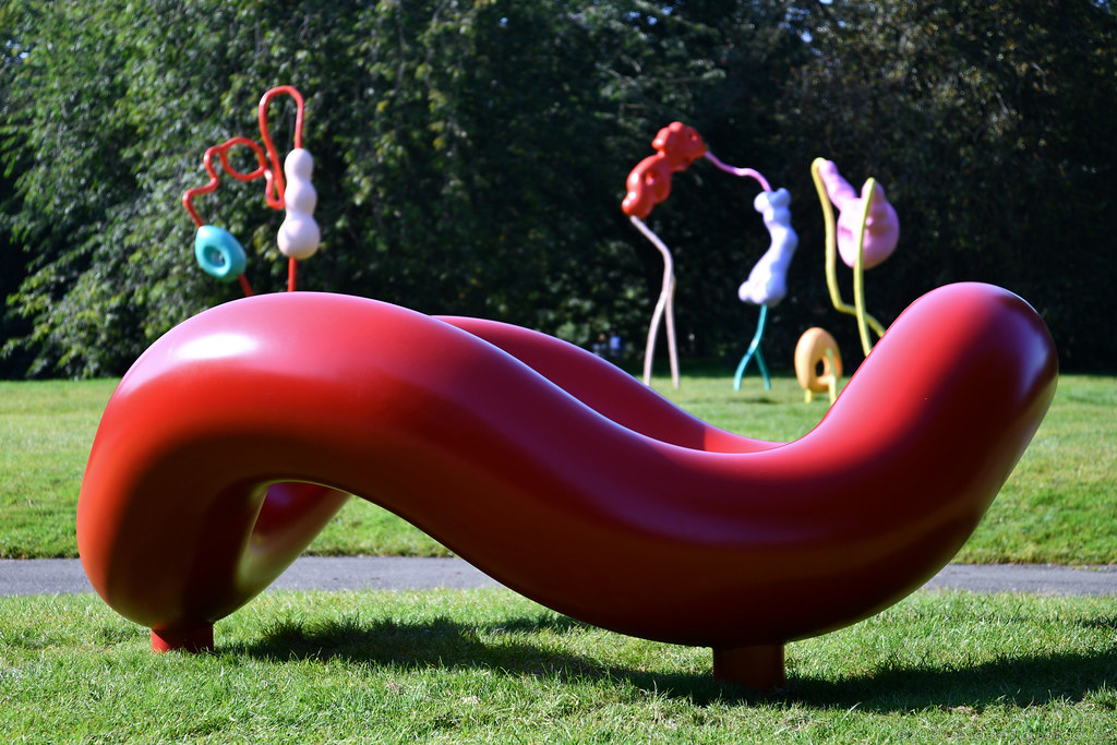 Red painted tubular-steel by Noguchi. At the 2021 Frieze Sculpture exhibition in Regent’s Park. London. Courtesy: Creative Commons