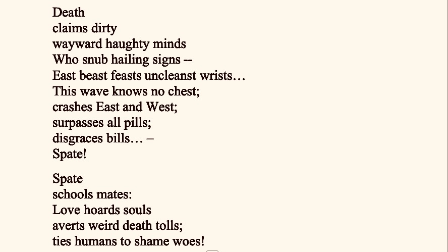 Young unsung African poets, playwrights and novelists too like Abubakar Isiaka Ubaji, Abullahi Jatta (The Kunta Kinte), Abubakar Ibrahim, Seun Sokoya, Ridwan Adelaja, Lekpele Nyamalon, Taofeeq Ogunperi, Nii-Ayi Solomon, Robert Ebi, Kinsley Nwadishi, Ndaba Sibanda, Darlignton Njobuewu, Kibrom Habtu, Muizat Kehinde Hameed, Alex O. Edevwie, Timileyin Olajuwon and the likes mostly pour their feelings on socio-economic and political decadence in the continent – perhaps because that’s the reality in their modern individual world.