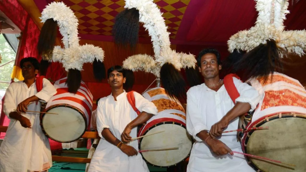 In any case, Durga Puja in Ramkrishna Mission was the most memorable experience of another religion I have ever had. The moment we would hear the tak dum tak dum of the drums pervade the spaces of our neighbourhood in the mostly warm but occasionally hot and humid end-autumnal days full of fleecy clouds in nearly always blue skies, our hearts would flutter. Those thrumming, magical beats announced unmistakably that the time for another fun-filled Saradiya[5]Puja week had come! The dhakkis or drummers, I do believe, were our Pied Pipers, for we would sprint like the spellbound children of Hamlin then to the open field in front of the mission prayer hall the moment we heard them. We would find them there pounding away on their drums, swaying and smiling and showing off their skills on those ponderous-seeming but colourfully decorated and deep-echoing dhols!