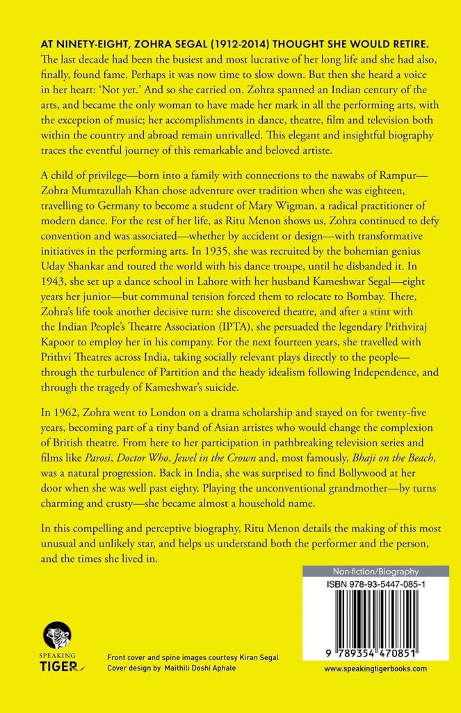Born a Khan in 1912, raised in purdah by the Nawabs of Rampur in palaces and mansions in Lucknow and Dehradun, educated in Queen Mary’s College of Lahore; trained in Western dance in pre-Hitler Germany; whirling through the globe and basking in limelight as the dancing partner of the phenomenal Uday Shankar; setting up her own dance school with husband Kameshwar Segal in pre-Partition Lahore; rising to carve a niche for herself as a member of Prithvi Theatres; dominating the screen as a nonagenarian cast against the legendary Amitabh Bachchan… Sahibzadi bestowed with an impulse to find her way in the world, made of her life what she would.