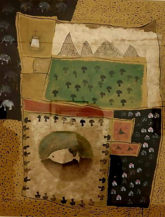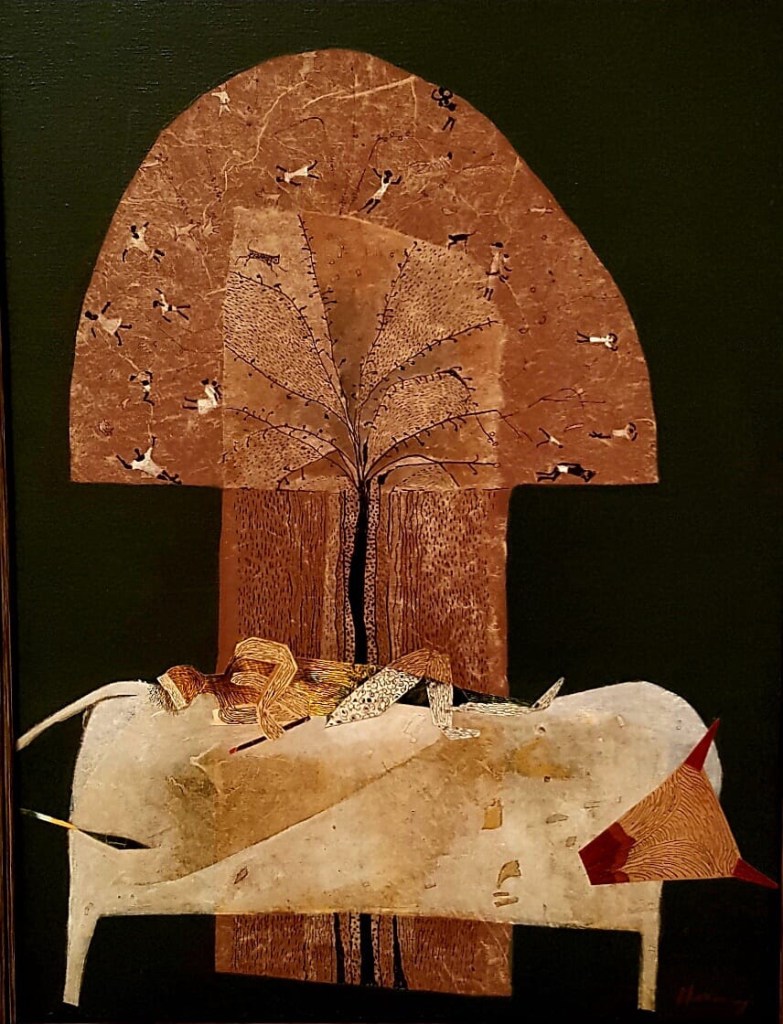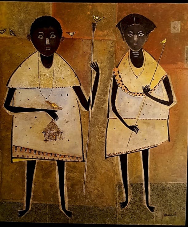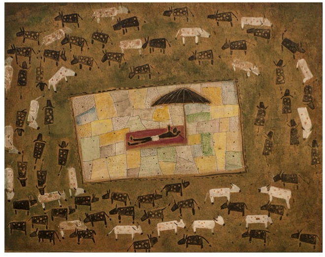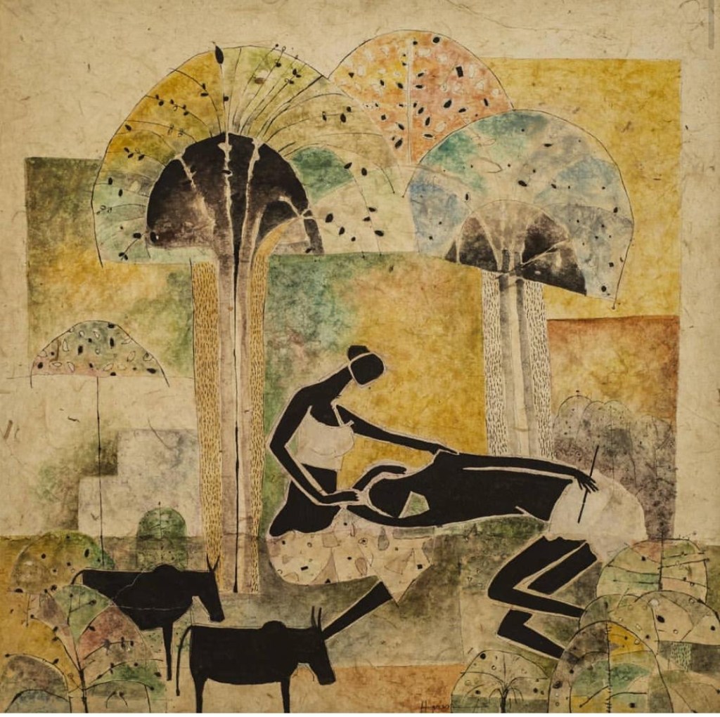 “I have always admired their direct application, the spontaneity of their form,” Haren further explains. “But I am influenced rather by the uncomplicated lives they lead. Since I was in Santiniketan I have admired the way they connect with nature in everything they do. Their intimacy with animals is incredible – they seem to be in dialogue with the animals they domesticate! This became a part of my visual world, especially when I came to live in Ranchi. The same reality imbues the lives of the natives – Oraon, Munda, Ho, Sabar, Bedia, Lohar… They rest under the tree unconcerned about how the ‘civilised’ world looks at them. They speak with the hills, with clouds in the sky, with cattle and kids, trees and waters, rivers and streams!”