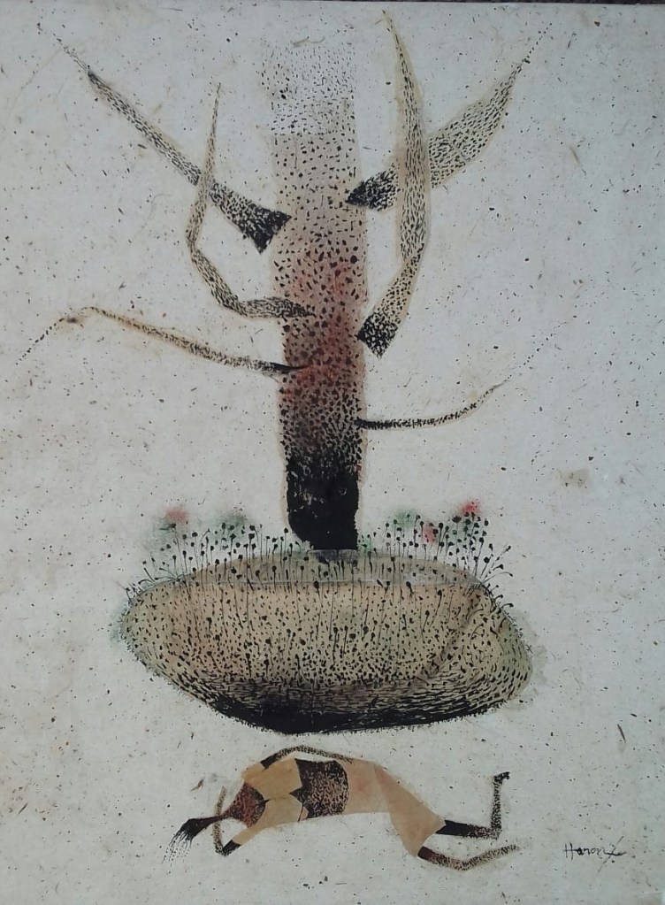 The Nepali rice paper became his signature in 1974. Prior to that he would work the rice paper in the tempera process that was ‘Master Moshai’ Nandalal Bose’s gharana, school – or Indian shaili, style. But in that process of painting layer by layer, the rice paper would lose its original character and serve merely as a background surface.