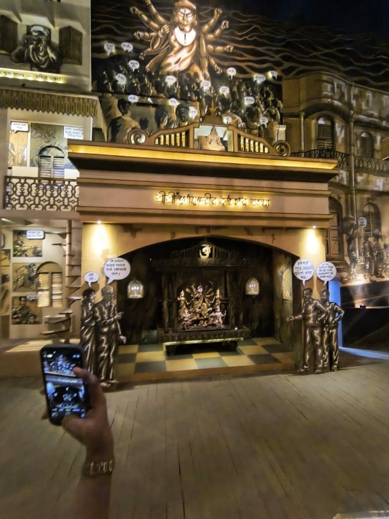Twenty years ago when I returned to make my home in Kolkata, Deshpriya Park was still home to a Sarbojanin Durgotsav[18]. But it hit the headlines in October 2015 when mayhem broke loose crushing surging crowds who had assembled to view the 88-foot “Biggest Durga Ever.” Effectively the community celebration had become a cause for corporate branding and competition. Sponsors, in some cases, outnumbered the – neighbourhood — ‘parar‘ — volunteers. Reason? Perhaps because television was trying to grab eyeballs in every home. Even Kumari Pujo at Ramakrishna Mission was being watched on screens across the oceans. And as the Arts Editor of The Times of India, I was planning celebrity visits and artistic trophies for our Pujo Barir Shera Pujo[19]competition in high rise buildings and gated communities.