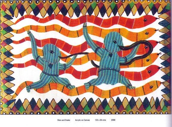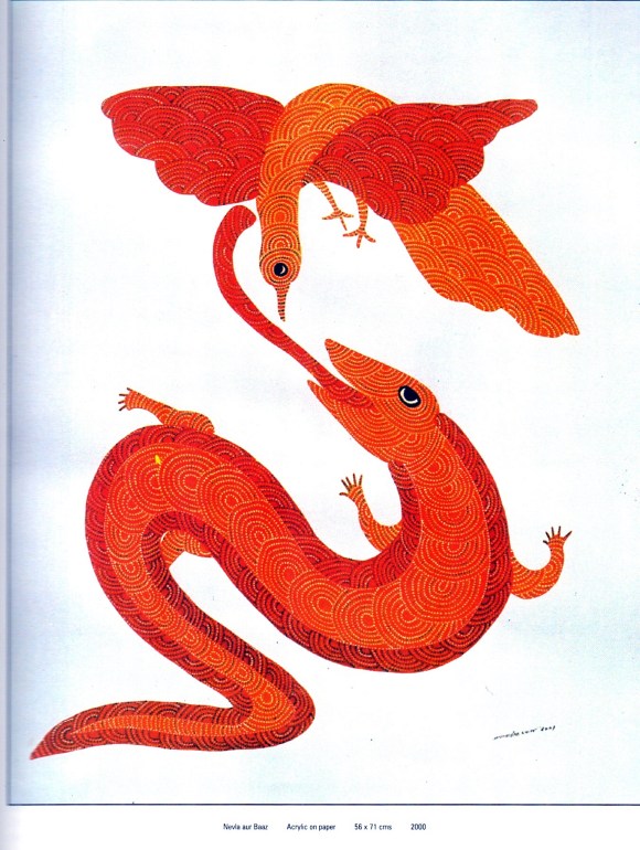 Dots and crosses, circles and squares all come into play as the vivacious blues and reds, yellows and greens acquire life. A line is not simply a straight line or curve: that would be an unappetising repetition. The quest for variety and individuality finds Kala Bai, Lado, Sumaru break up the lines into an intricate arrangement of countless motifs. When the subject is the same, as too the colour, it’s the dots and crosses, dashes and stars that give the work the imprint of individuality. In the process, these artists who work in a community and send off their creations to markets in distant cities, have worked out a way of ‘patenting’ artistic property. Tradition did not require them to ever sign off a work with their names. In the age of copyright awareness and intellectual property rights, they might put their signatures on the canvas – but the unmistakable imprint of the artists lie in the manner of their assembling the familiar patterns.