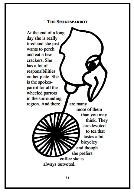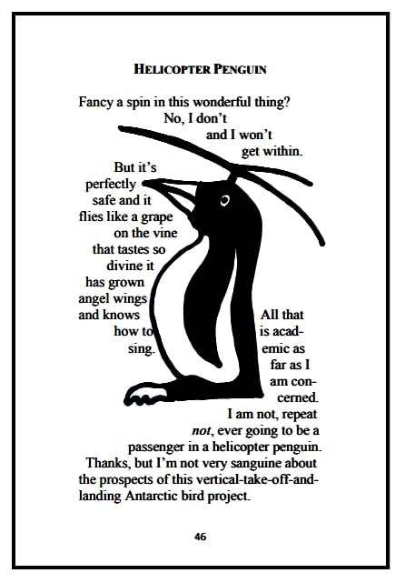 I thought that if I doodled one monster every day, and wrote a poem for it, the book would be completed after two months or so. But I found that I was doodling more than one a day, sometimes four or five. I decided to stop only when I ran out of blank pages in the notebook I was using for my doodles. The result is that there are 54 monsters. One of the monsters, the ‘Unfeasible Space Giraffe’, covers three pages because he has such a long neck. He can stand on the surface of one planet and nibble the leaves of the trees that grow on another planet. But all the other monsters occupy one page to themselves. I wrote poems for each doodle as I went along. The monsters came first every time. The shape and size of each monster determined the length and structure of each poem, because I had to fill the remaining space with words and sometimes the remaining space wasn’t very much. I often curled and curved the poems around the bodies of the monsters and I allowed myself to enjoy certain typographical tricks, such as having text upside down or in the shape of a wave.