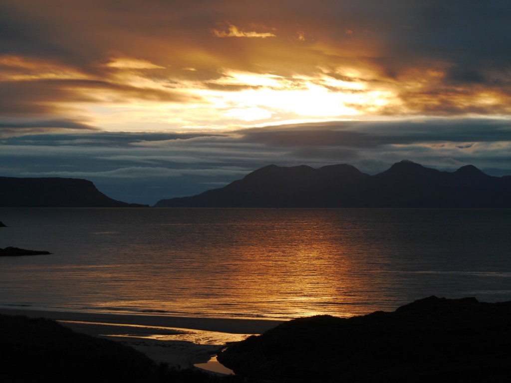 Traigh Beach lies on the west coast of the Scottish Highlands, and from it you look out towards the islands of Eigg, Rhum, and Skye; you look out towards sunset.