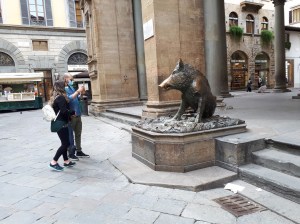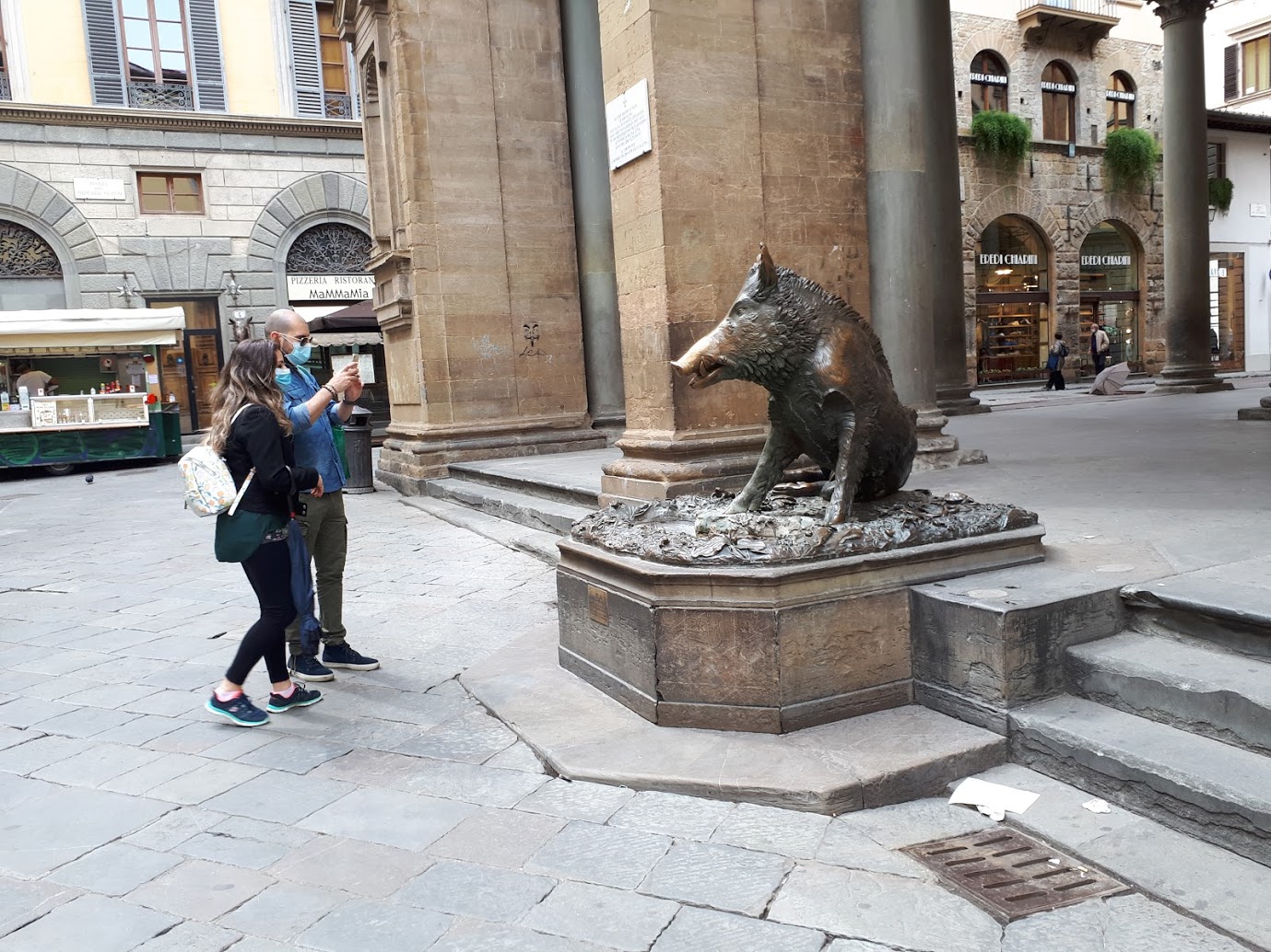 The lockdown is over and the Florentines are back, walking in the streets, wearing face masks, but free to go wherever they want, provided that they don’t form groups (“assembramenti“). A few tourists can be seen, slowly walking around, a little bewildered. Below, you see a picture of a few days ago with two lone tourists taking a picture of the “Porcellino” (Wild Boar) (the boar looks a little bewildered, too.).