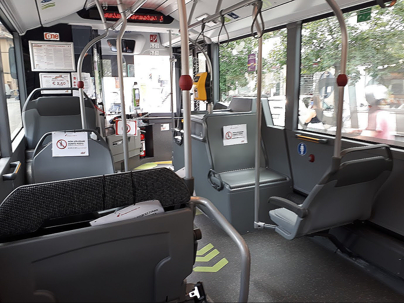 Many shops have reopened, but not all of them — maybe 30% are still closed. For what I could see this morning downtown, all the open shops are empty of customers. The restaurants also look empty. The buses are nearly empty, too. Here is a picture taken this morning, with me and my wife the only passengers of a bus that used to be packed full before the epidemic. Note the signs saying “You cannot sit here!” They don’t seem to be necessary, given the situation.