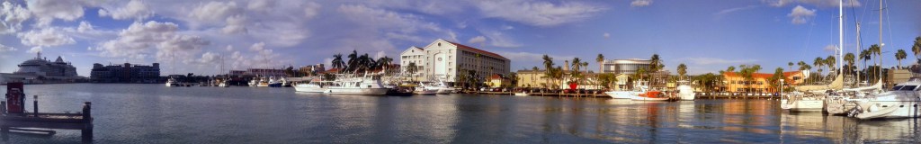 Once you leave the houses behind, the dogs are absent. A linear park runs from the airport to the cruise ship terminal. The path is paved with red stones and lined with divi-divi trees.